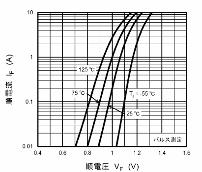 順方向電圧VFはダイオードに流す順方向電流IFとジャンクション温度Tjによって決まります。