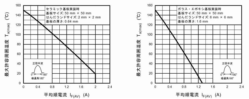例)平均順電流IF(AV)=1.0Aの場合、最大許容周囲温度Ta(max)=90℃となる。