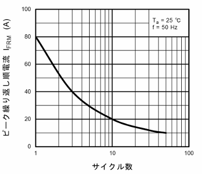 規定の温度下で、50Hzの正弦半波、もしくは10msの矩形波を1サイクル順方向に印加したときにダイオードが破壊されない最大許容電流値。