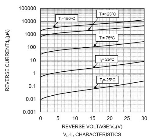 例)ジャンクション温度Tj=25℃、逆方向電圧VR=20Vの場合、逆方向電流IR=0.1μAとなる。