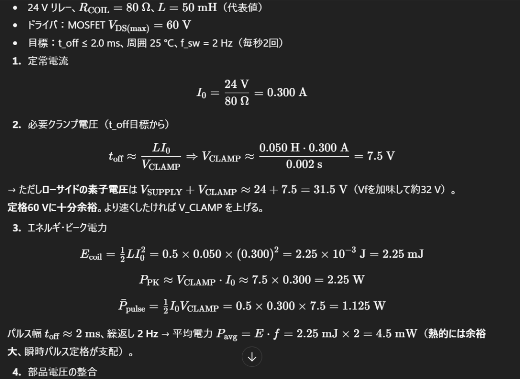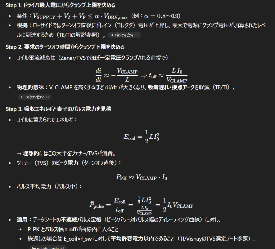もし具体のコイル仕様(R, L, I_0, V_DS(max), 繰返し)をご提示いただければ、V_Z候補(数値)→TVS型番→t_off 実測想定値まで落とし込みます