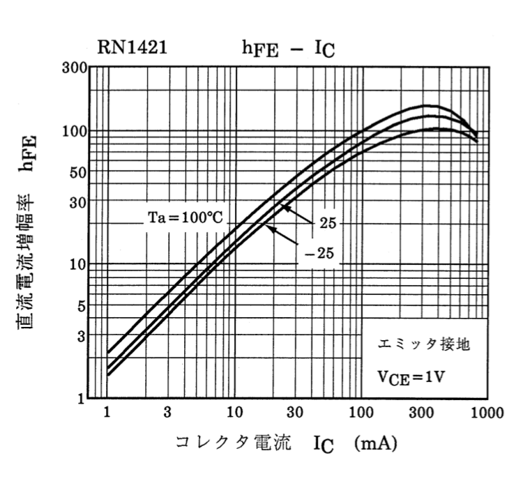 スイッチング用途の場合は飽和領域(増幅率が上昇しているとき)の増幅率を参照しますので、
