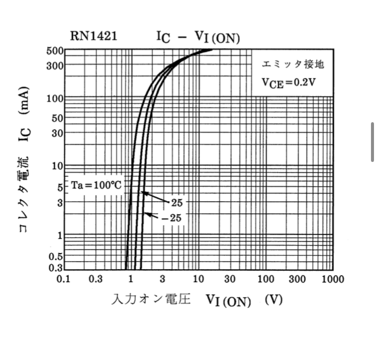 例)コレクタ電流Ic=5mAの時、下記グラフよりオン電圧Vi(on)=1.5V、データシートの電気的特性よりIc=100m A、VCE=0.2Vの時オン電圧Vi(on)=3.5V、下記グラフの同条件時のオン電圧は2.5Vのため部品ばらつきが+1.0Vあると考えられる。よって部品ばらつきを考慮したオン電圧Vi(on)=1.5+1.0=2.5Vとなる。