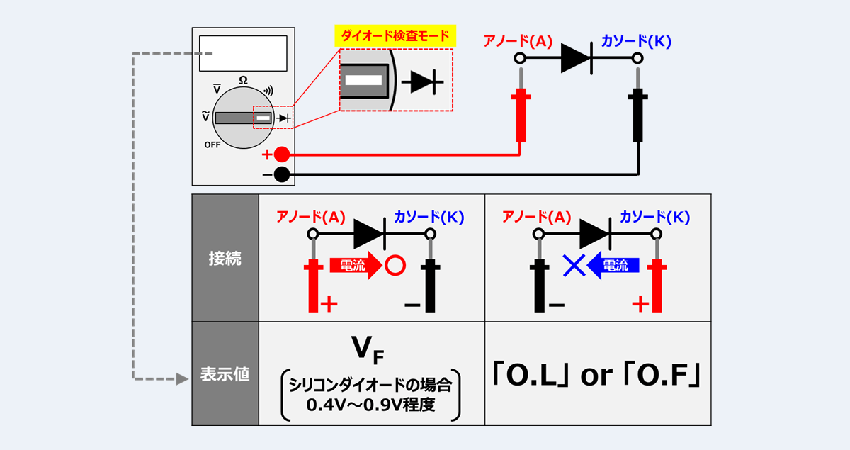 テスターの赤いプローブ(+側)を素子の片側に、黒のプローブ(-側)をもう片方に接触させる