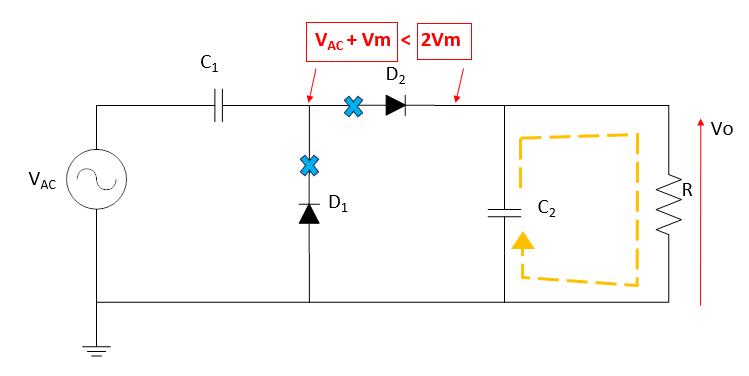 そのため、D1は逆方向電圧で電流が流れず、C2とRに電流が流れるようになる。これにより、C2は充電されていき、